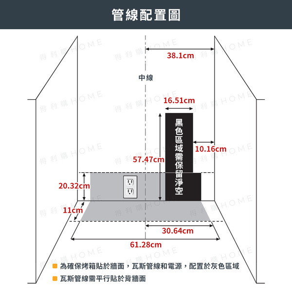 | 安裝預留尺寸 | 櫃體寬度 76.2 公分 櫃體深度 63.5 公分 (切齊機身) 檯面高度 91.5 公分 |